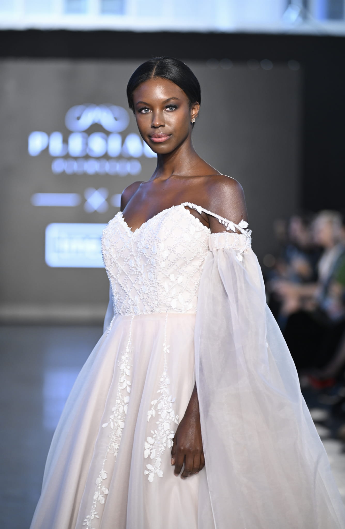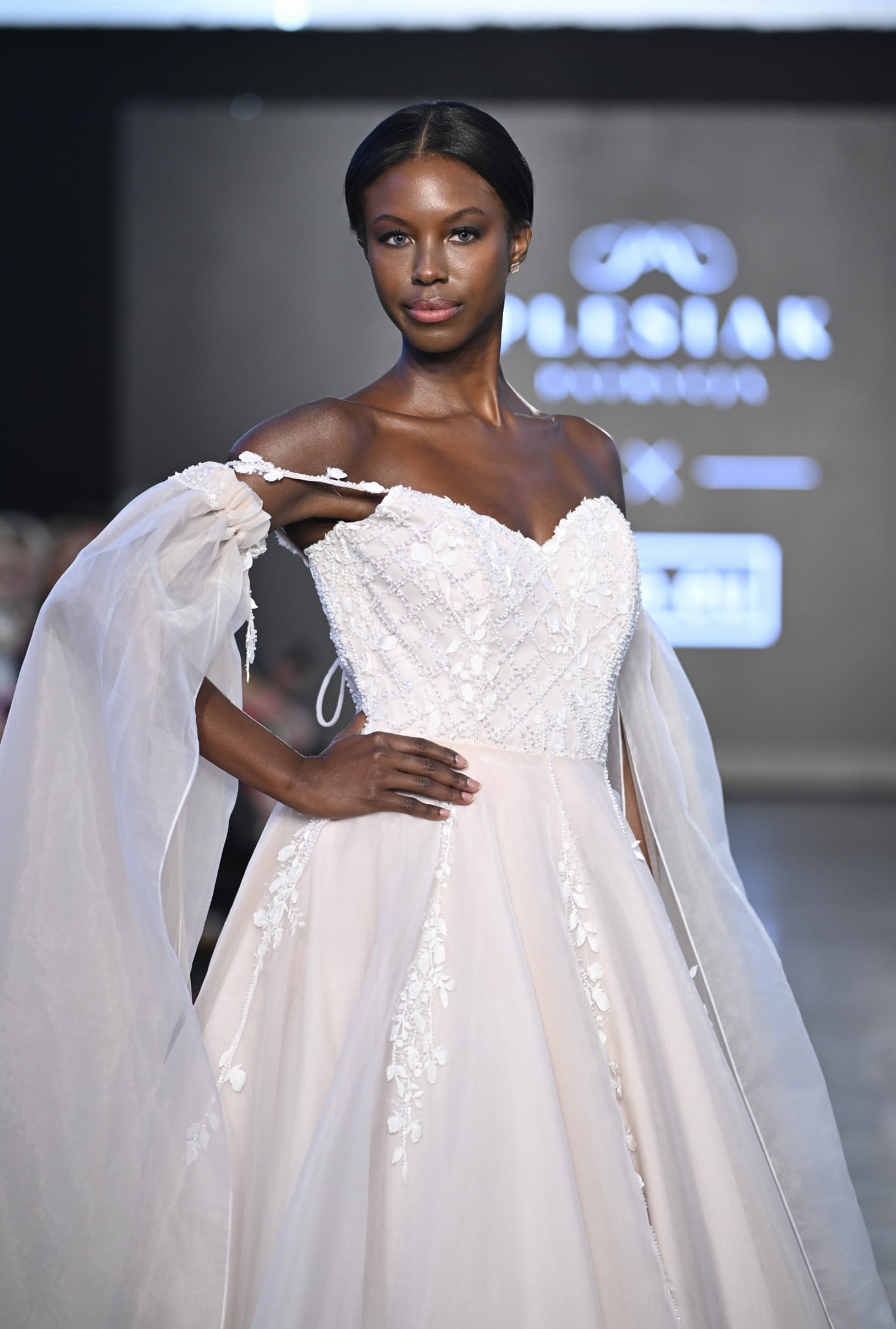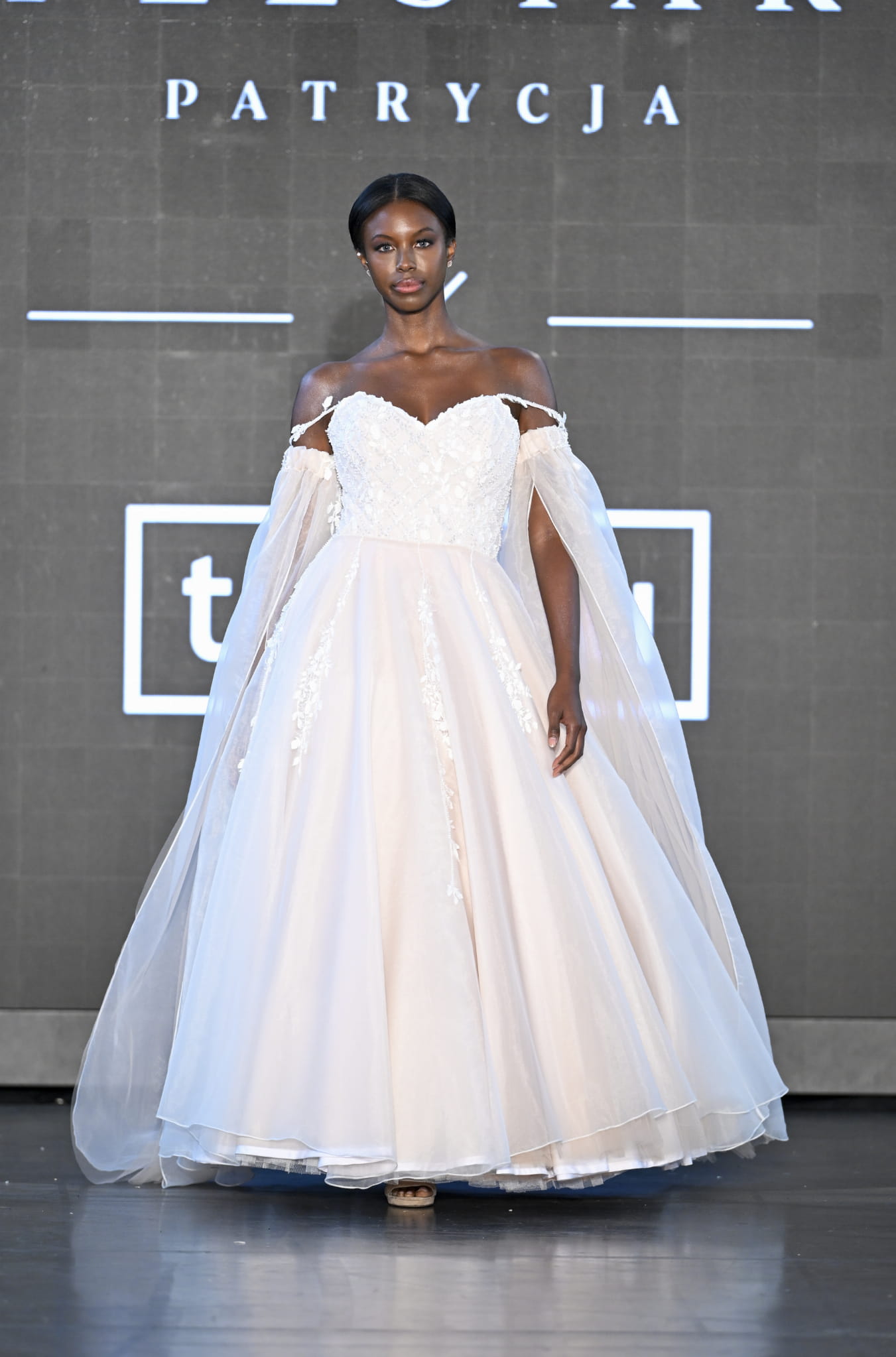 Klasyczny dół w kształcie koła, zbudowany z wielu warstw podszewki, halki i ekskluzywnej organzy, został ręcznie ozdobiony naszywaną koronką. Dodatkowe elementy, takie jak delikatne ramiączka oraz zakładane osobno długie, transparentne rękawy z organzy, wzbogacają kreację o nutę subtelnej elegancji.